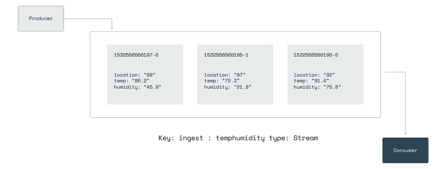 [ 'location', '96', 'temp', '15.4', 'humidity', '70' ]The consumer stores the last entry ID that it read in a Redis string at the key consumer:lastid. It uses this string to pick up from where it left off after it is restarted. Try this out by stopping it with Ctrl+C and restarting it.