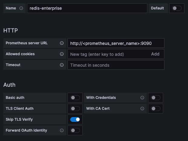 <cluster_name>with your Redis Software cluster's FQDN:global: scrape_interval: 15s evaluation_interval: 15s # Attach these labels to any time series or alerts when communicating with # external systems (federation, remote storage, Alertmanager). external_labels: monitor: "prometheus-stack-monitor" # Load and evaluate rules in this file every 'evaluation_interval' seconds. #rule_files: # - "first.rules" # - "second.rules" scrape_configs: # scrape Prometheus itself - job_name: prometheus scrape_interval: 10s scrape_timeout: 5s static_configs: - targets: ["localhost:9090"] # scrape Redis Software - job_name: redis-enterprise scrape_interval: 30s scrape_timeout: 30s metrics_path: /v2 scheme: https tls_config: insecure_skip_verify: true static_configs: - targets: ["<cluster_name>:8070"] -