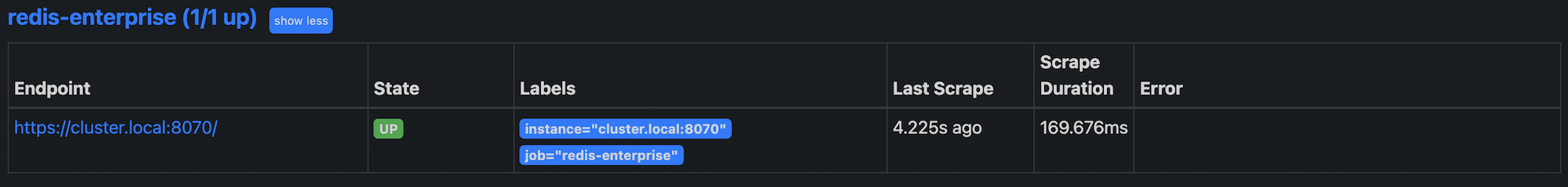 Select Status and then Targets to check that Prometheus is collecting data from your Redis Software cluster.