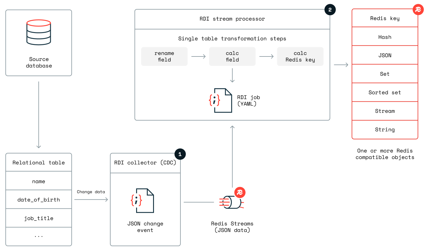 By default, RDI transforms the source data into hashes or JSON objects for the target with a standard data mapping and a standard format for the key. However, you can also provide your own custom transformation jobs for each source table, using your own data mapping and key pattern. You specify these jobs declaratively with YAML configuration files that require no coding.