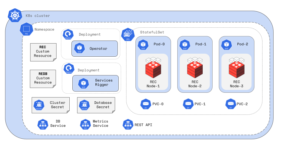 A Redis cluster is created and managed by the RedisEnterpriseCluster (REC) custom resource. Changes to the REC configuration file prompt the operator to make changes to the cluster. The REC is required for both standard databases (REDB) and Active-Active databases (REAADB).
