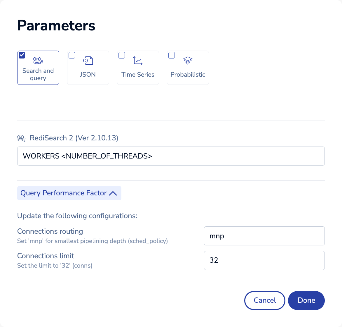 Starting with Redis Software 8.x, you can configure the query performance factor using the query_performance_factor object in the BDB object. You no longer need to manually set sched_policy, conns, or module WORKERS parameters. Changes take effect immediately without restarting shards.