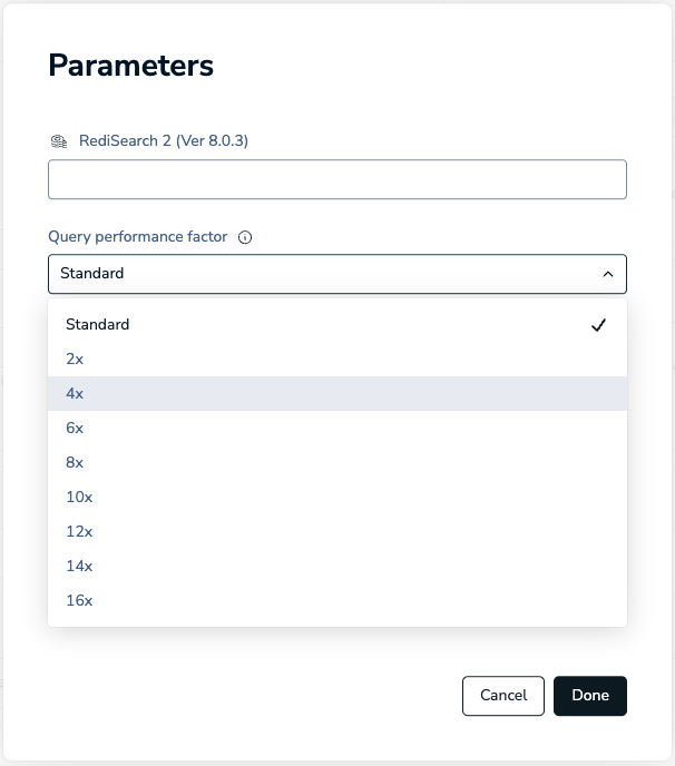 Starting with Redis Software 8.x, configuring the query performance factor is simplified. You can select the query performance factor directly from the Cluster Manager UI without manually setting connection routing, connection limits, or module parameters. Changes to the query performance factor for existing databases take effect immediately without restarting shards.