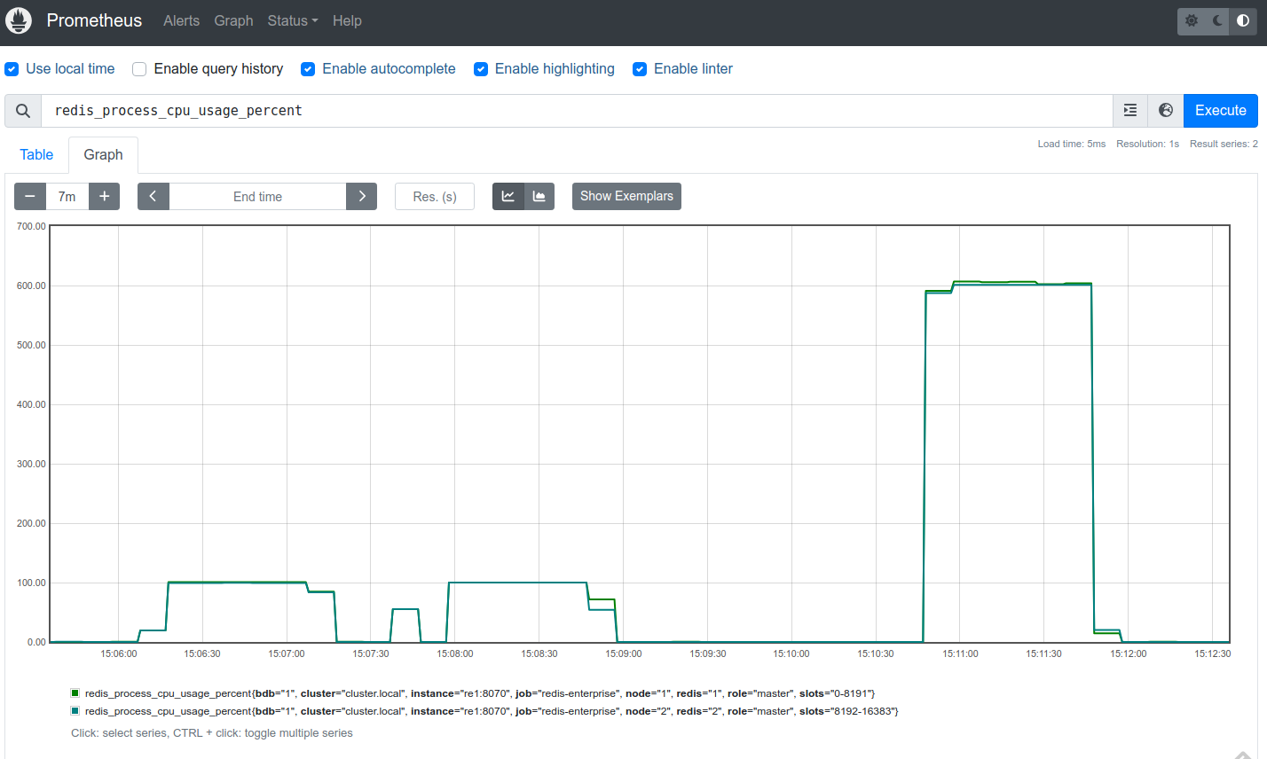 redis_process_cpu_usage_percentshard metric.The following Prometheus UI screenshot shows