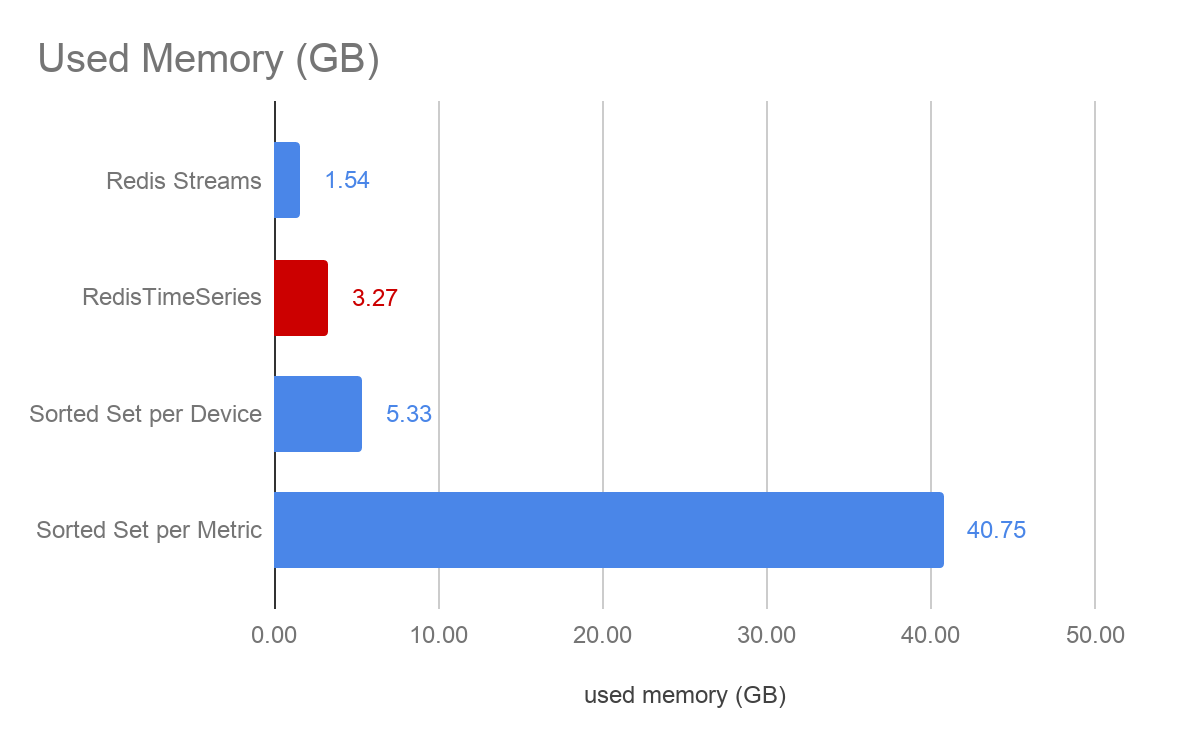 For both the Redis streams and sorted set approaches, the samples were stored as strings, while time series stored them as doubles. In this specific data set, we chose a CPU measurement with rounded integer values between 0-100, which thus consumes two bytes of memory as a string. With time series, each metric had 64-bit precision.