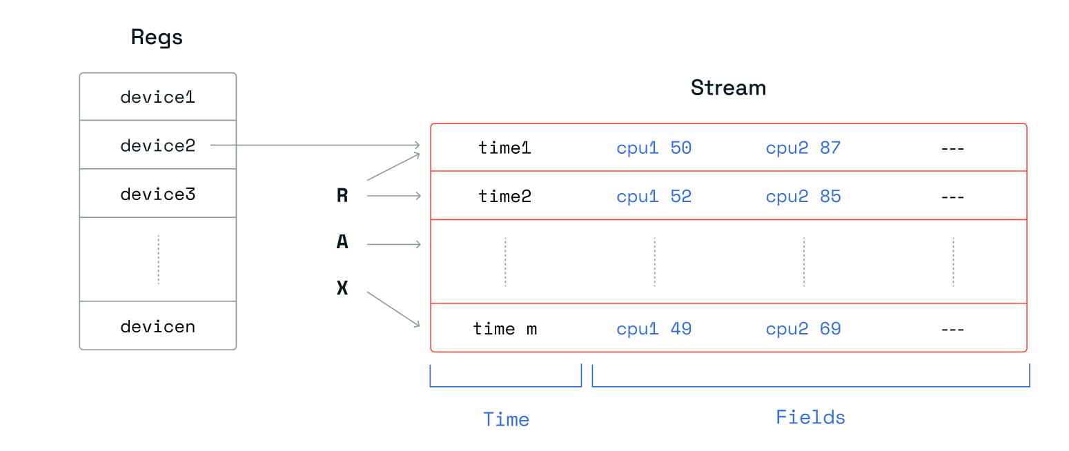 Redis streams allow you to add several field value pairs in a message for a given timestamp. For each device, we collected 10 metrics that were modeled as 10 separate fields in a single stream message.