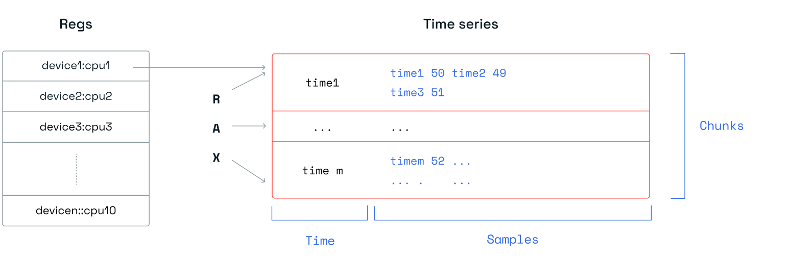 Each time series holds a single metric. We chose this design to maintain the Redis principle that a larger number of small keys is better than a fewer number of large keys.