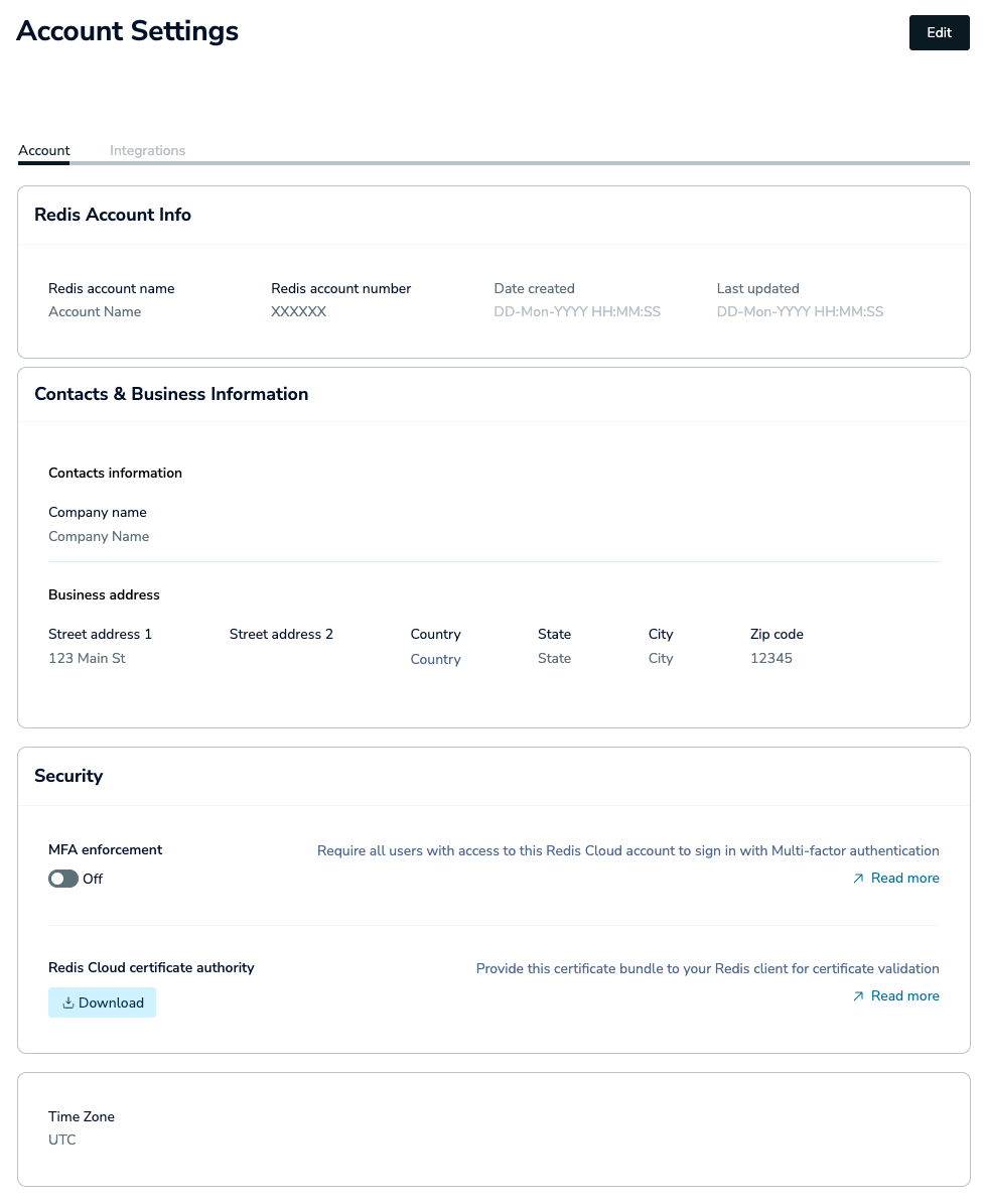 To review or manage the settings associated with your Redis Cloud account, sign in to the Redis Cloud console and then select Account Settings from the menu.