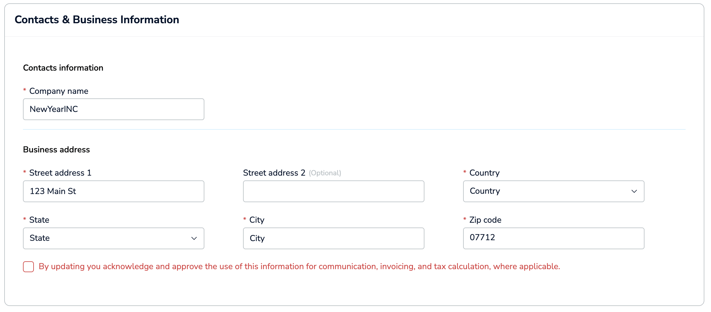 In addition, this section may include fields unique to your location. For example, certain regions require tax IDs or other regulatory details.