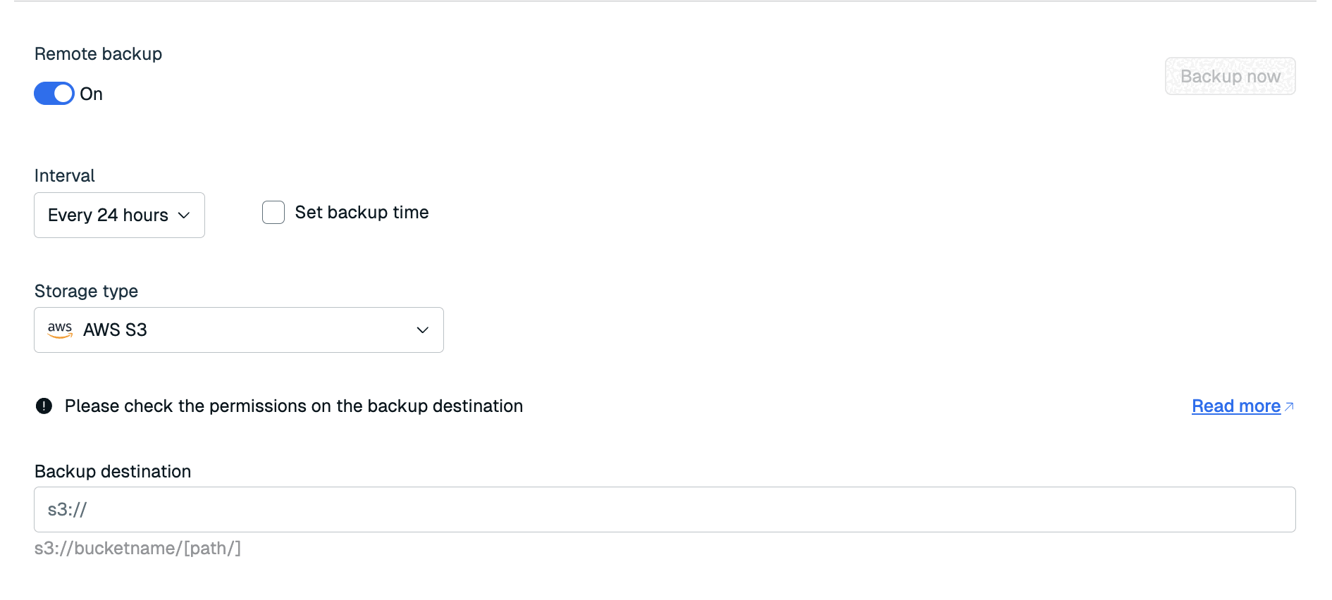 Once the bucket is available and the permissions are set, use the name of your bucket as the Backup destination for your database's Remote backup settings. For example, suppose your bucket is named backups-bucket. In that case, set Backup destination to s3://backups-bucket.