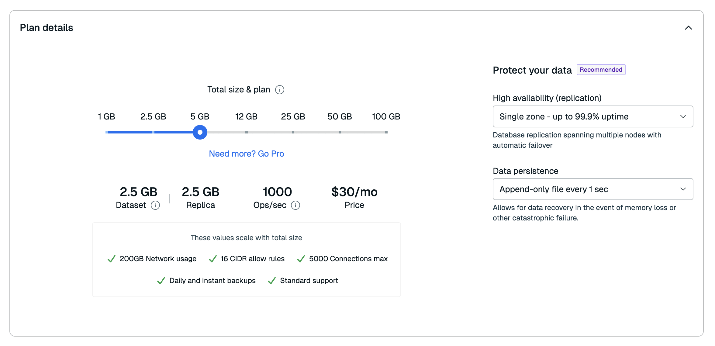 During the Sizing step, when you are provisioning your databases, you can select the RAM percentage for your database. The default is 20%, but you can select a percentage between 10% and 50%. Lower RAM percentages reduce cost but may increase latency, while higher RAM percentages improve throughput and latency at higher cost.