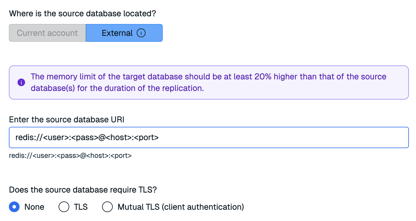 Select Current account if the source database is located in this Redis Cloud account.