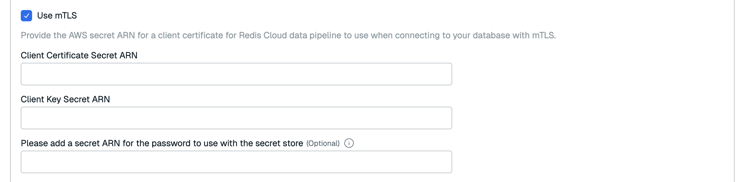If your database requires mTLS with a client key passphrase, enter the ARN of your Client key passphrase secret in the Please add a secret ARN for the password to use with the secret store field.