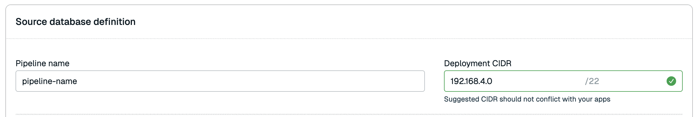 A Deployment CIDR is automatically generated for you. If, for any reason, a CIDR is not generated, enter a valid CIDR that does not conflict with your applications or other databases.