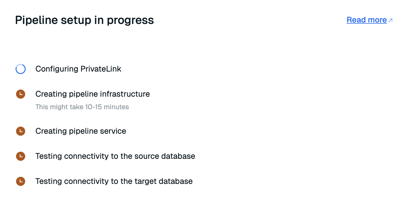 Pipelines are provisioned in the background. You aren't allowed to make changes to your data pipeline or to your database during provisioning. This process will take about an hour, so you can close the window and come back later.