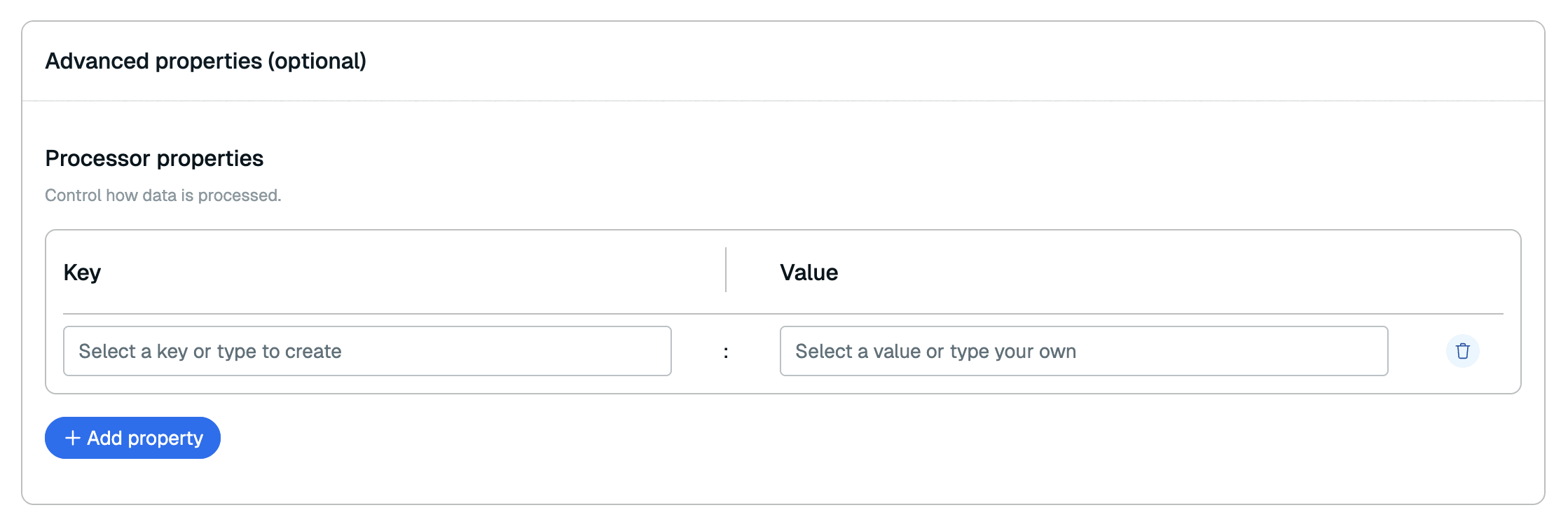 In the Advanced properties section, you can add any processor properties to control how the data is processed. See the RDI configuration file reference for all available processor properties.