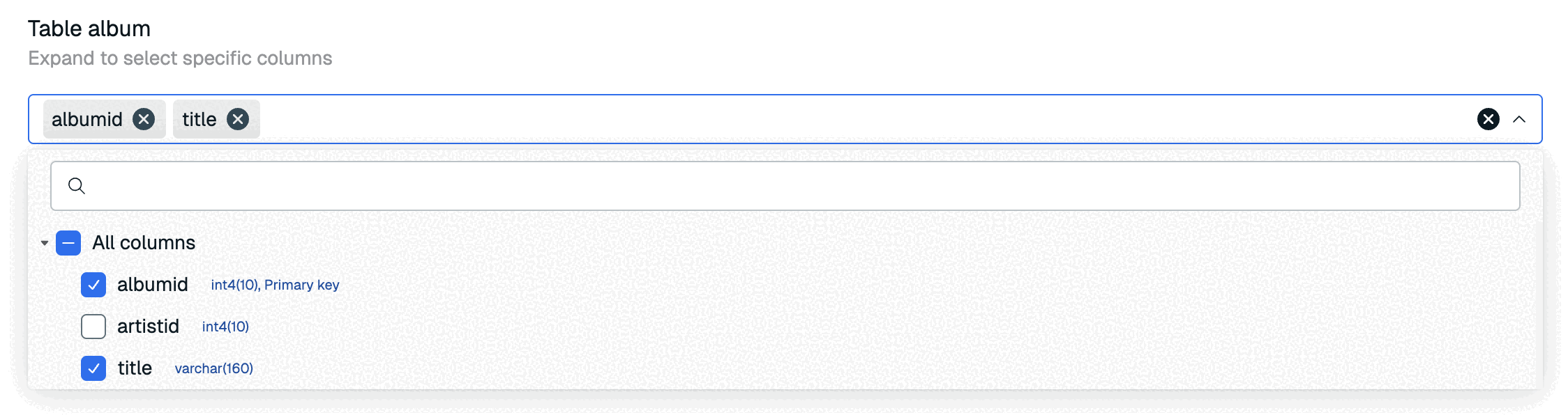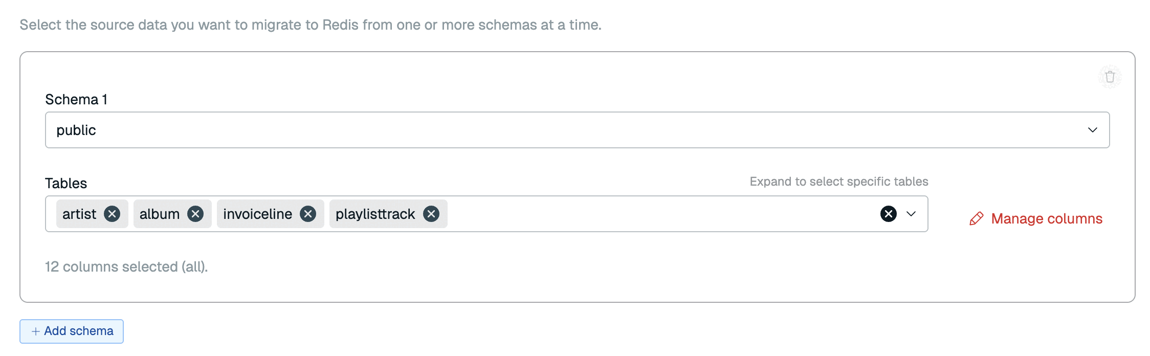 After your pipeline is provisioned, you will be able to define your pipeline. You will select the database schemas, tables, and columns that you want to import and synchronize with your primary database.