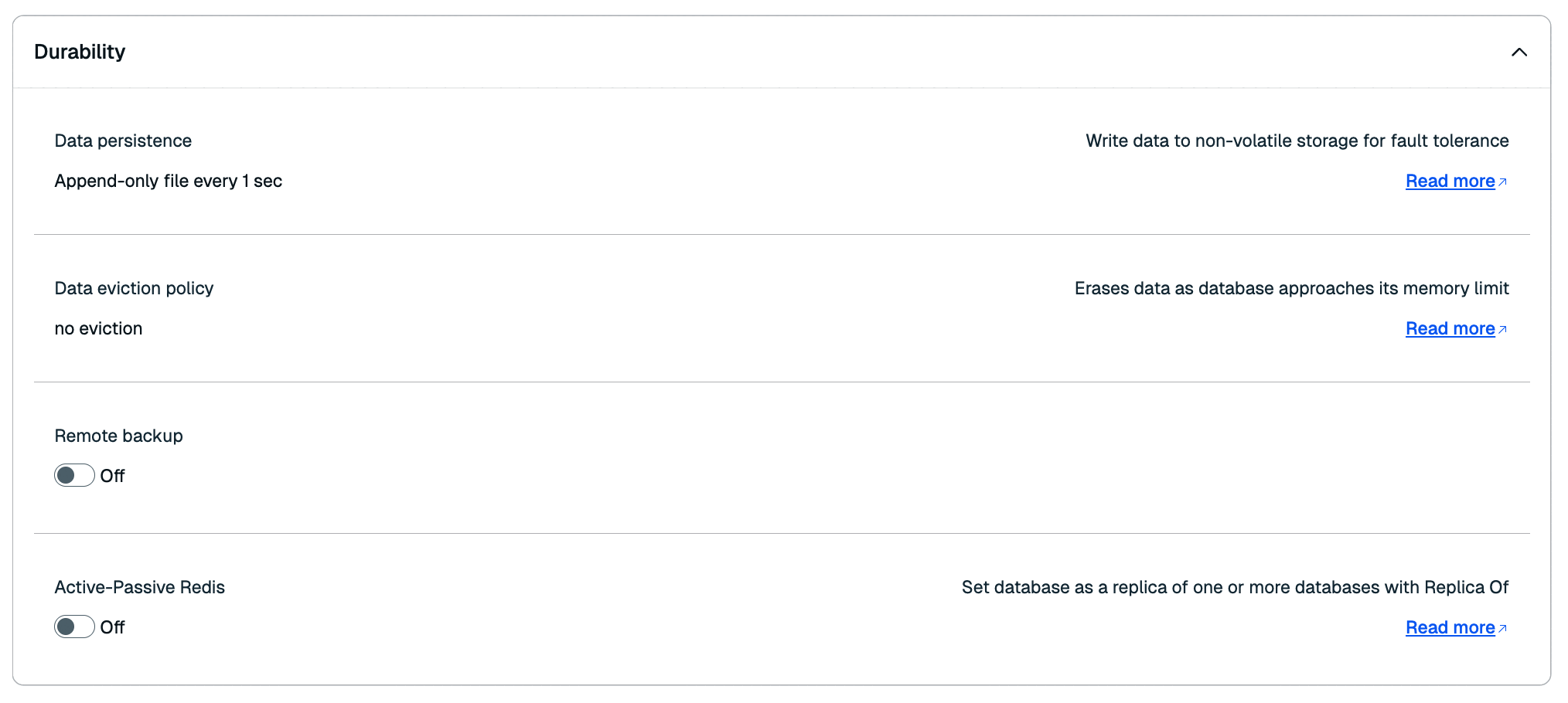 The Durability section helps protect your data when problems occur. These settings define replication, persistence, backup, and eviction policies.