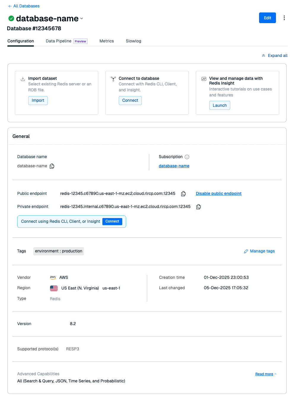 | Public endpoint | Public URI used by any application or client to access the database. Redis Cloud Pro databases can block the public endpoint. |