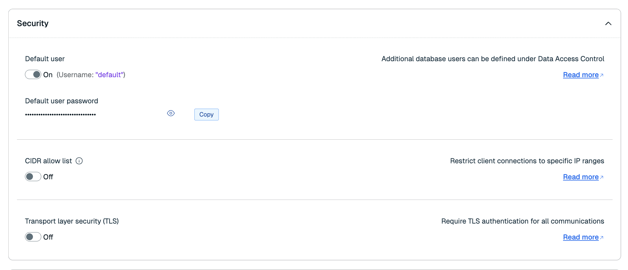 | Default user password | Password for default user. A default password is assigned to the database on creation and may be updated. If you block the public endpoint, you can also turn on passwordless authentication for the default user here. |