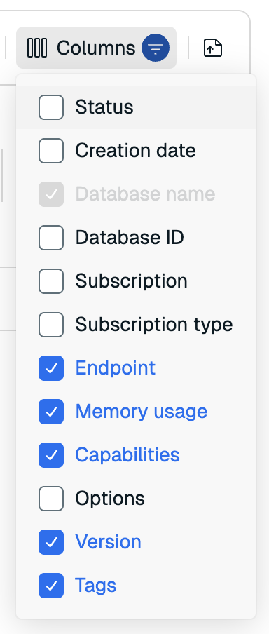 Sort the list in descending or ascending order using the arrow displayed to right of the field name in the header. Supported fields include Subscription, Database name, Memory usage, and Version.