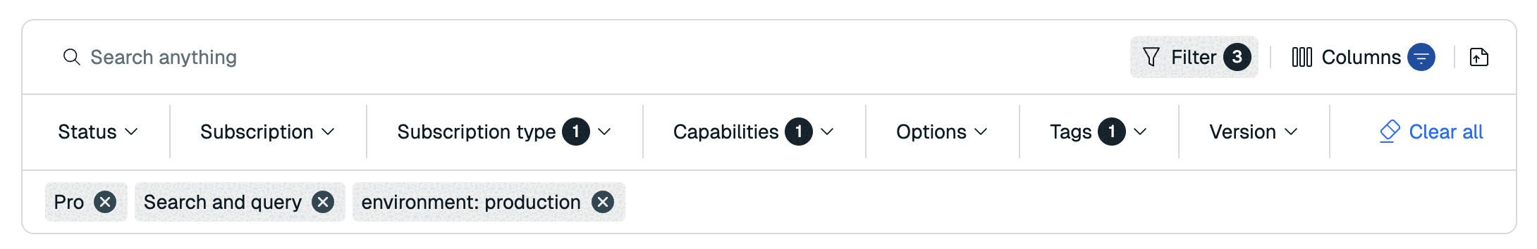 You can filter the list on Status, Subscription, Subscription Type, Capabilities, Options, Tags, and Version.