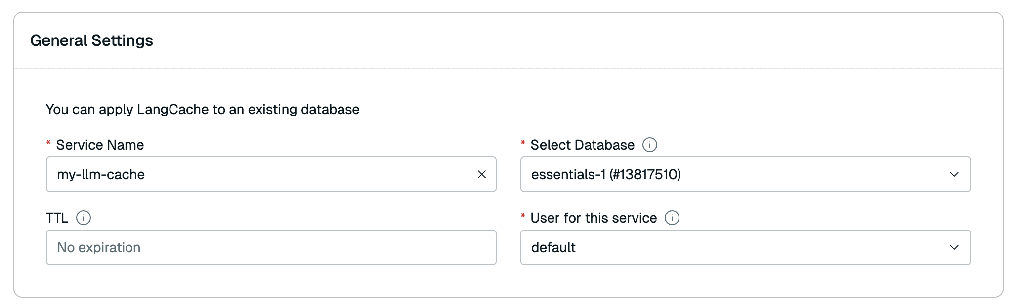 | User for this service | The database access user to use for this service. LangCache only supports the default user during public preview. |