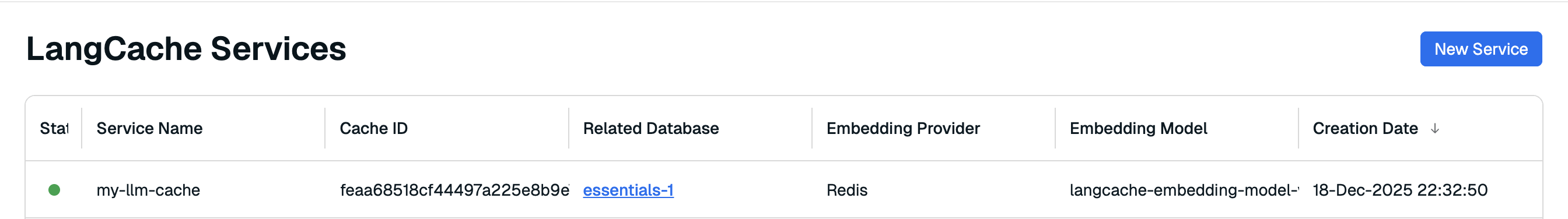 This page displays a list of all LangCache services associated with your account.