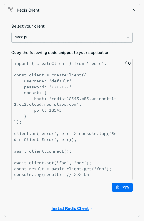 A Redis client is a software library or tool that enables applications to interact with a Redis server. Each client has its own syntax and installation process. For help with a specific client, see the client's documentation.