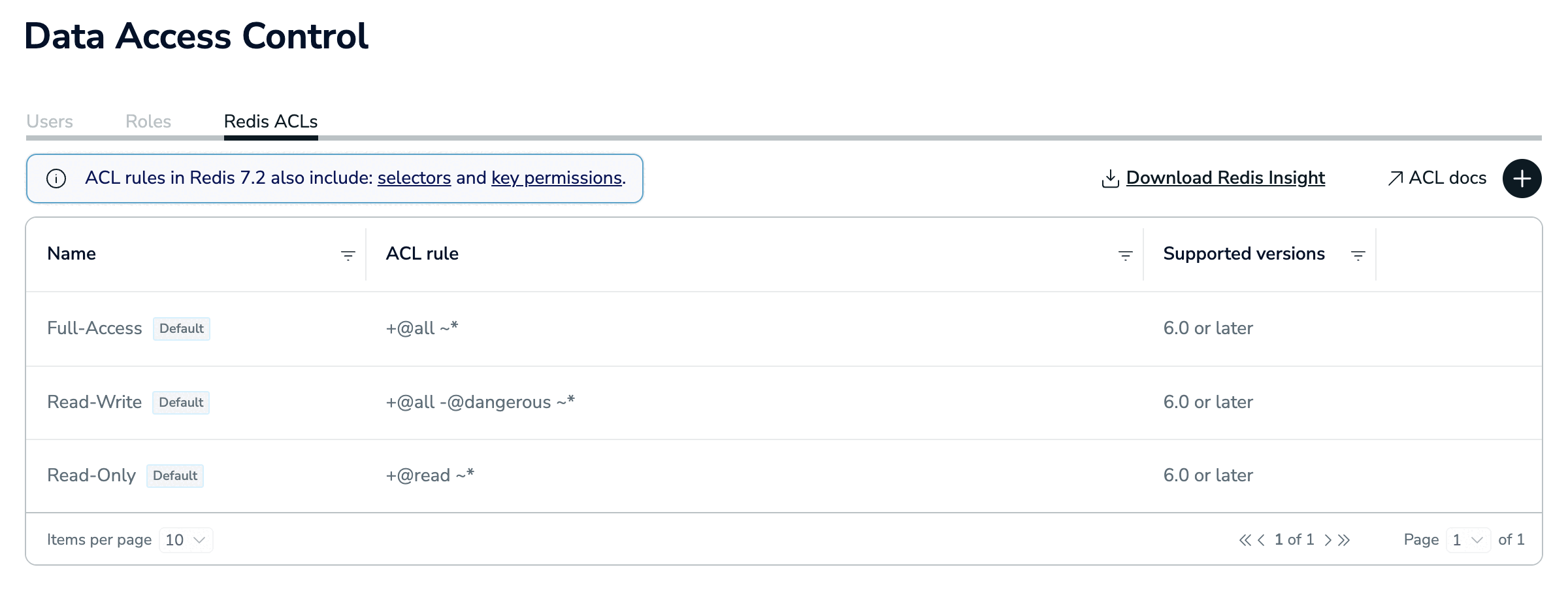 There are three tabs on this screen: Users, Roles, and Redis ACLs.