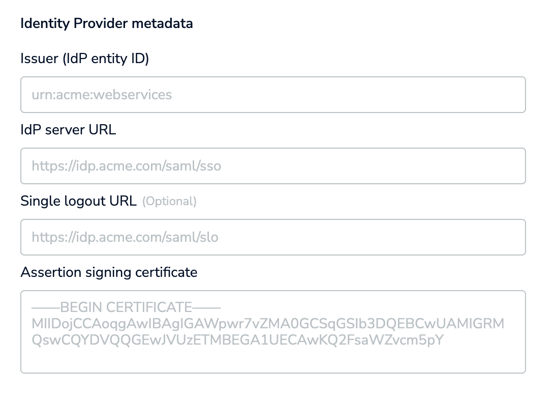 Setting Description Issuer (IdP entity ID) The unique entity ID for the identity provider IdP server URL The identity provider's HTTPS URL for SAML SSO Single logout URL The URL used to sign out of the identity provider and connected apps (optional) Assertion signing certificate Public SHA-256 certificate used to validate SAML assertions from the identity provider To find these metadata values, see your identity provider's documentation.