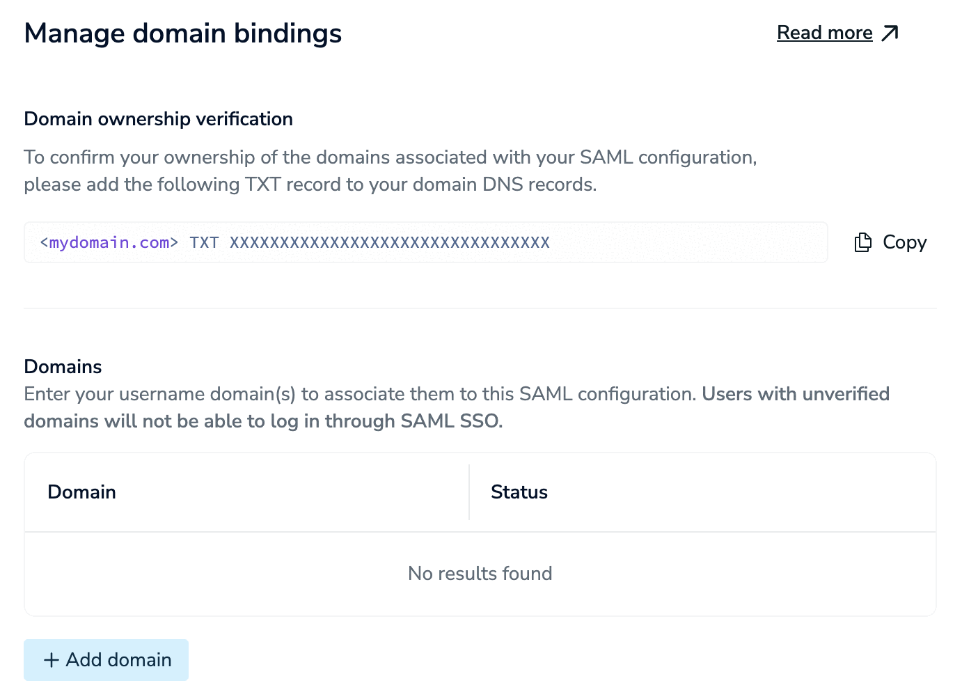 From the SAML screen of the Redis Cloud console, you must verify you own the domains associated with your SAML configuration. Select Add domain to open the Manage domain bindings panel.