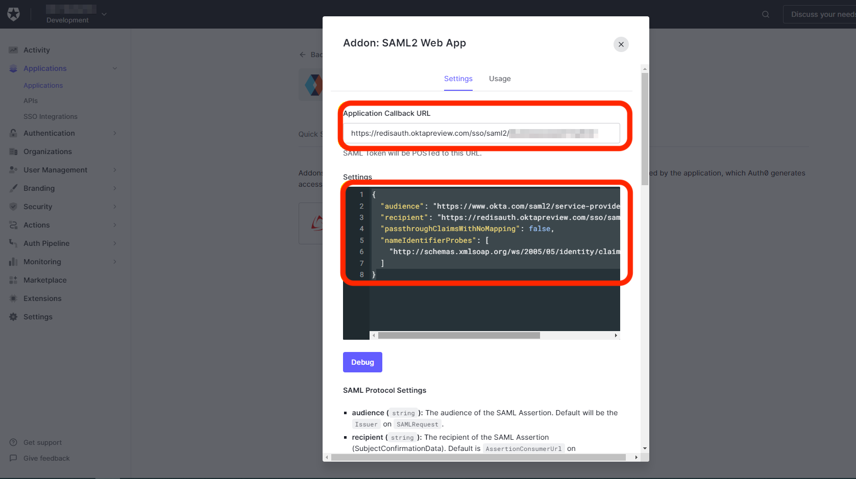 Return to the Auth0 SAML application and select Addons > SAML 2 Web App > Settings: