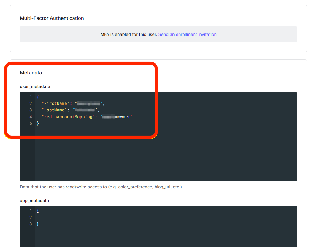 redisAccountMappingconsists of a lowercase role name (owner, member, manager, billing_admin, or viewer) and your Redis Cloud Account ID found in the account settings.{ "FirstName": "Test", "LastName": "User", "redisAccountMapping": "YOUR_REDIS_CLOUD_ID=owner" } -