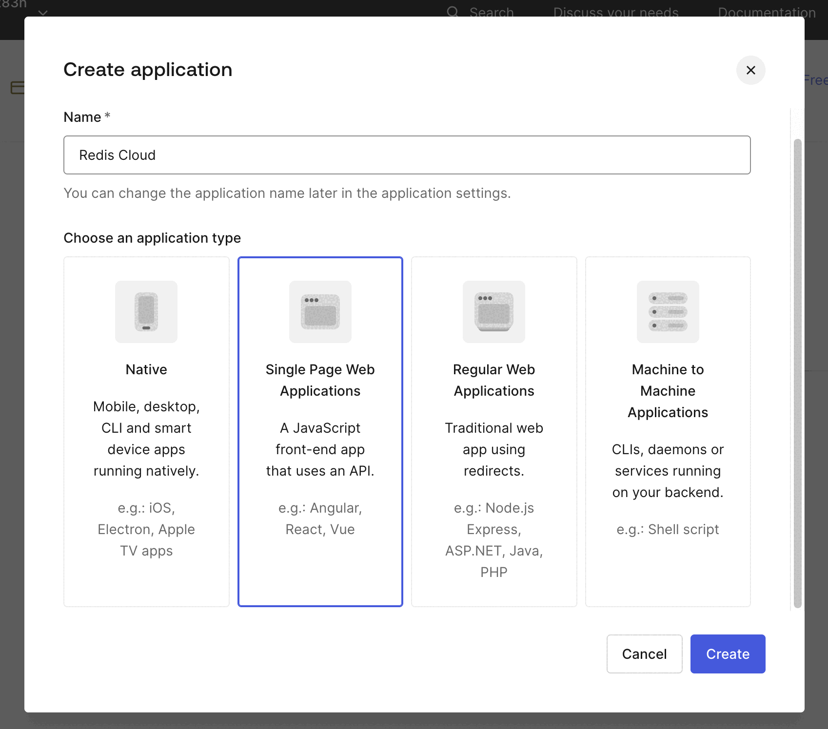 Provide a name for the Application and select Single Page Web Applications. Select Create.