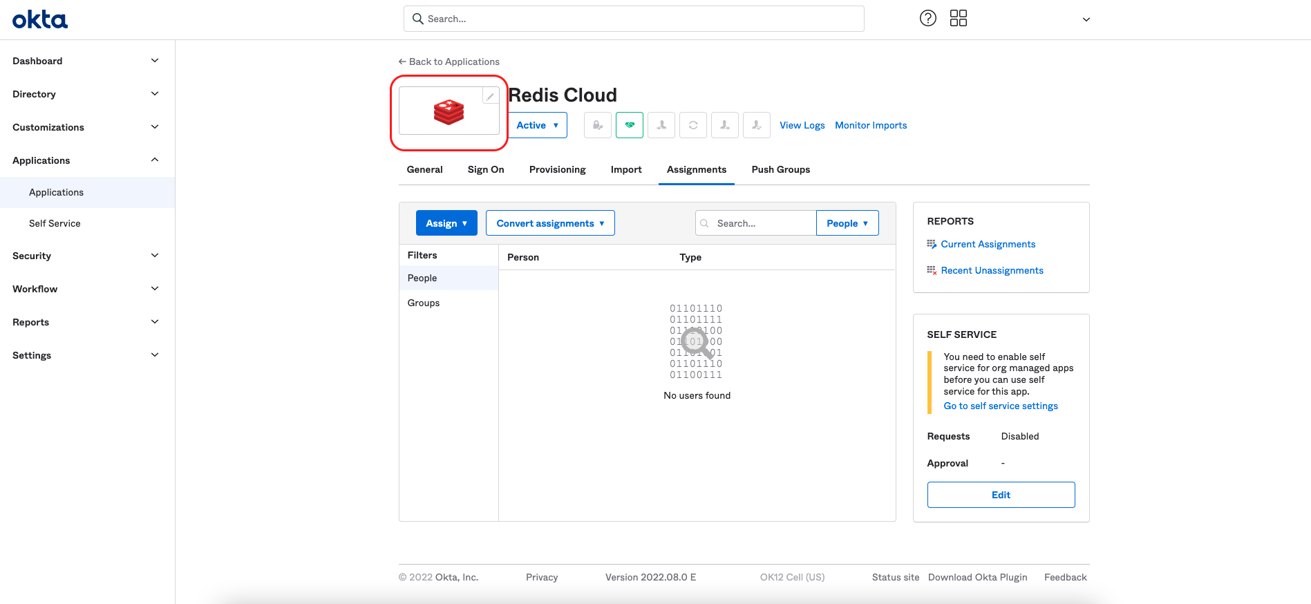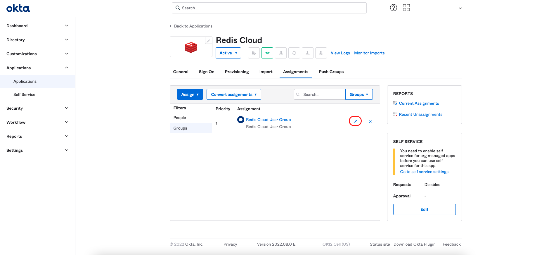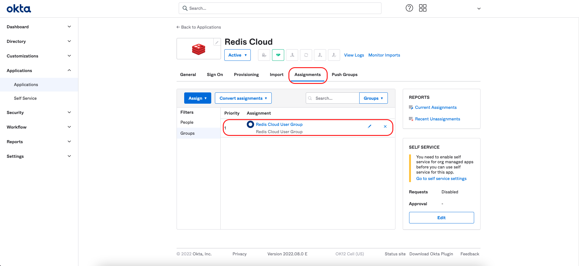 From the menu, select Applications > Applications > Redis Cloud. Then, select Assign to groups.