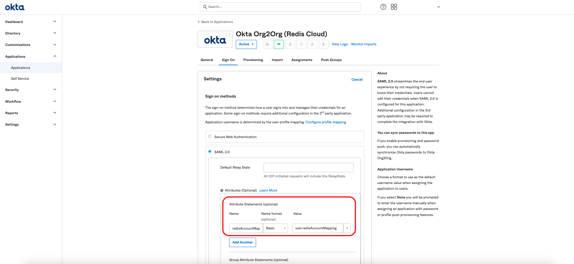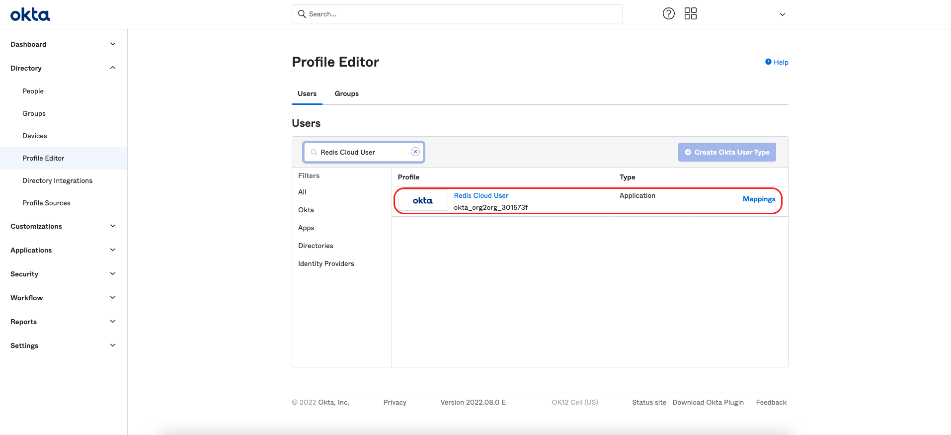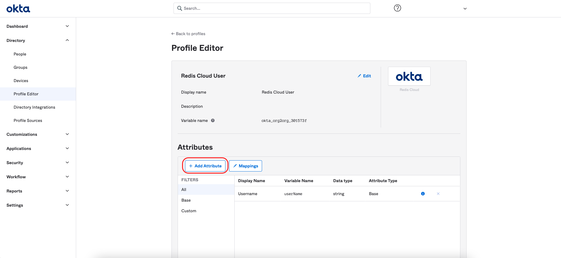 In the left menu, select Directory > Profile Editor, then select Redis Cloud User.