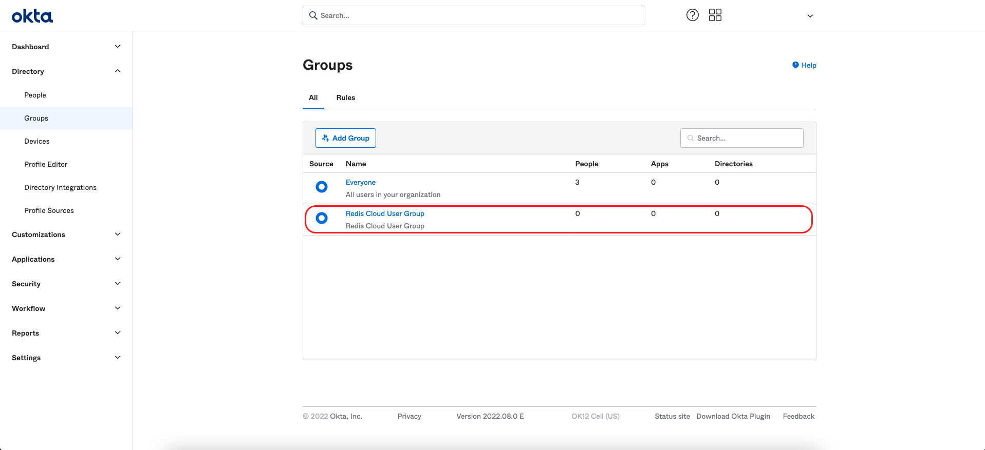 Now that our SAML IdP is configured, create an Okta group and assign the Redis Cloud application.