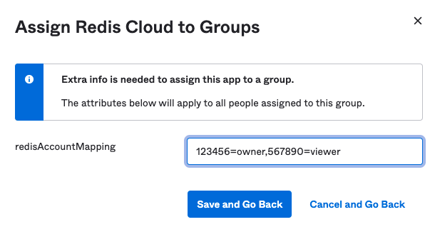 Now, define the Redis account mapping string default for this group and select Save and go back. The key-value pair consists of the lowercase role name (owner, member, manager, billing_admin, or viewer) and your Redis Cloud Account ID found in the account settings. Select "Done".