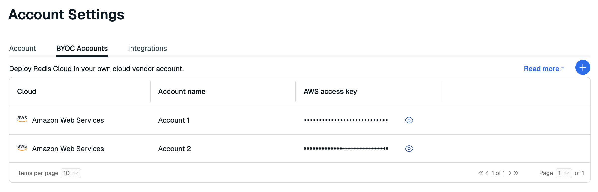 To add a new cloud account to your Redis Cloud subscription, select the Add button from the BYOC Accounts tab of the Account Settings screen.