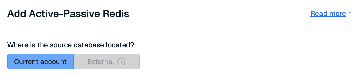 This will open the Add Active-Passive Redis screen. Select Current account to connect a database in your current account.
