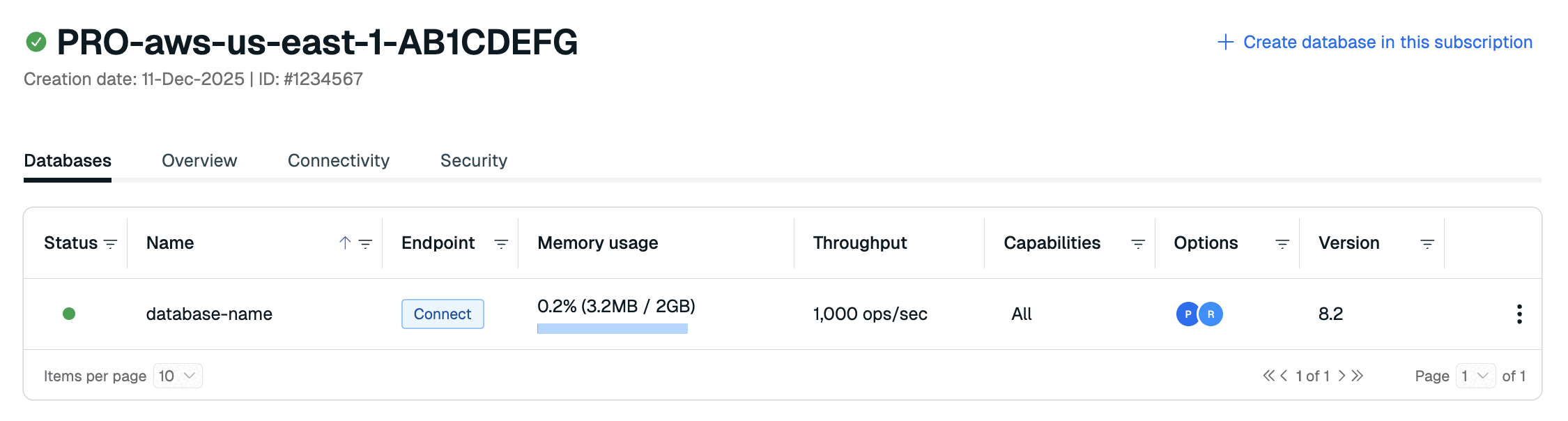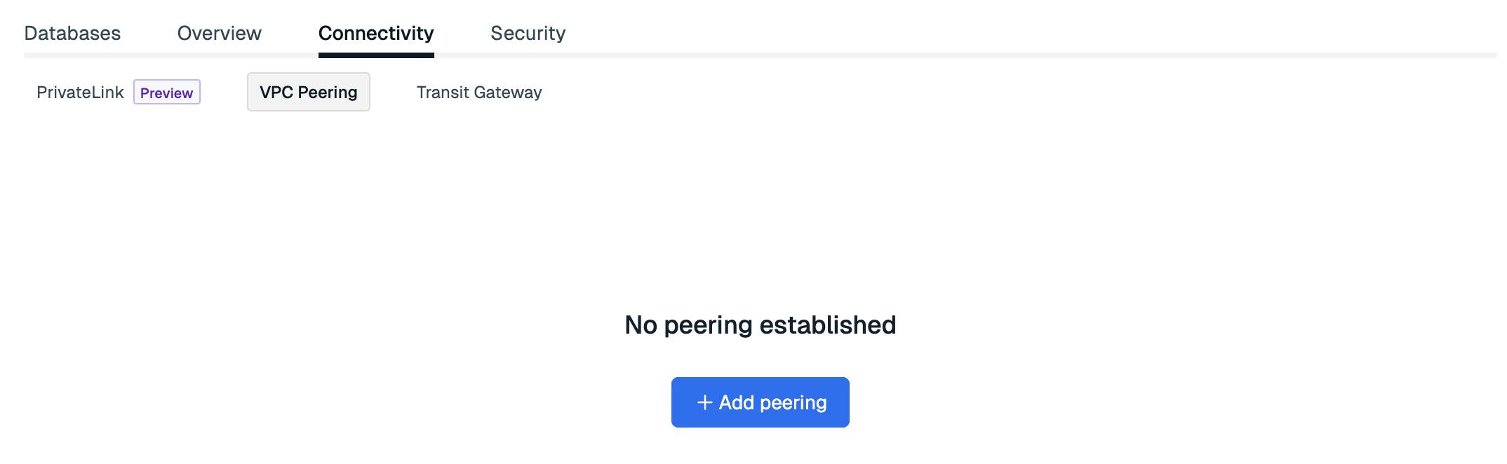 The Connectivity tab lets you limit access to the subscription by defining a VPC peering or other connectivity options.
