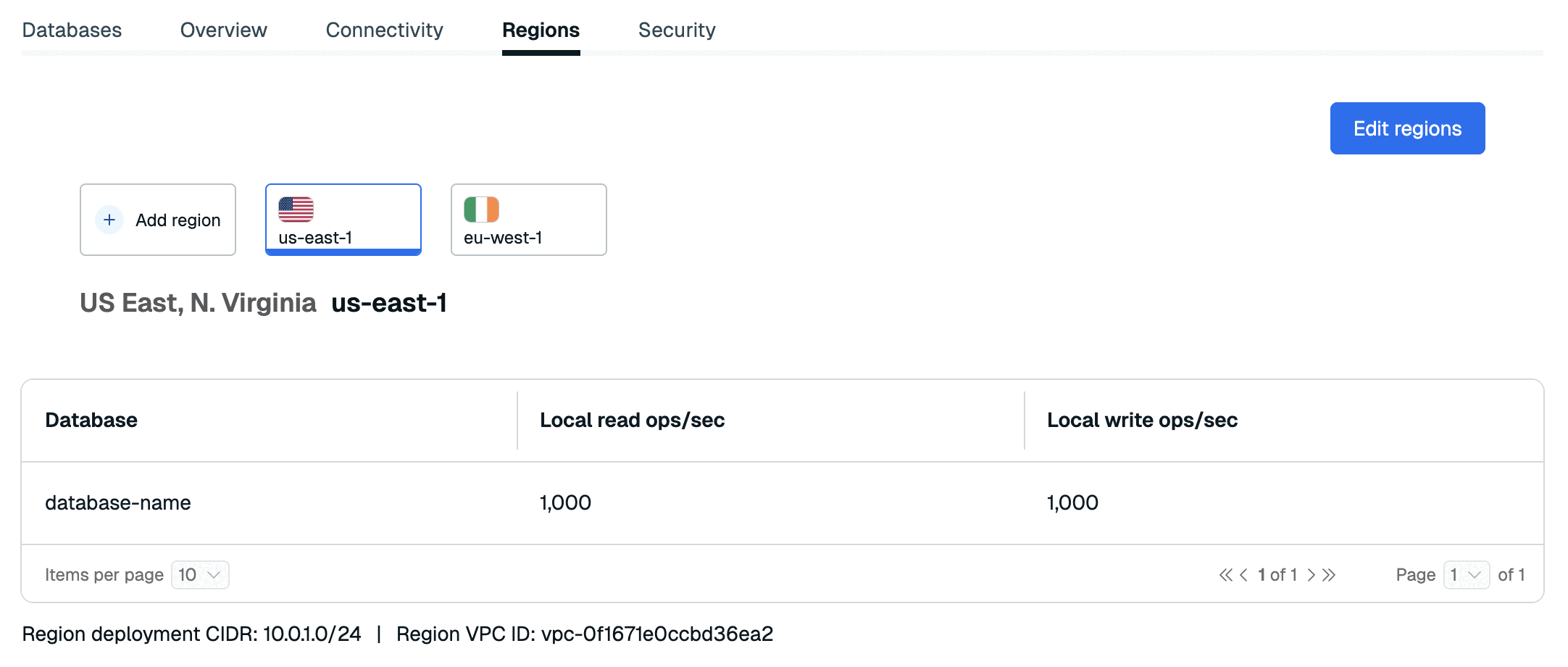 The Regions tab lets you manage the regions in your Active-Active subscription (Active-Active subscriptions only).