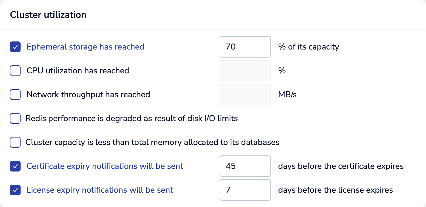 PUT /v1/cluster { "alert_settings": { "cluster_license_about_to_expire": { "enabled": true, "threshold": "30" } } }