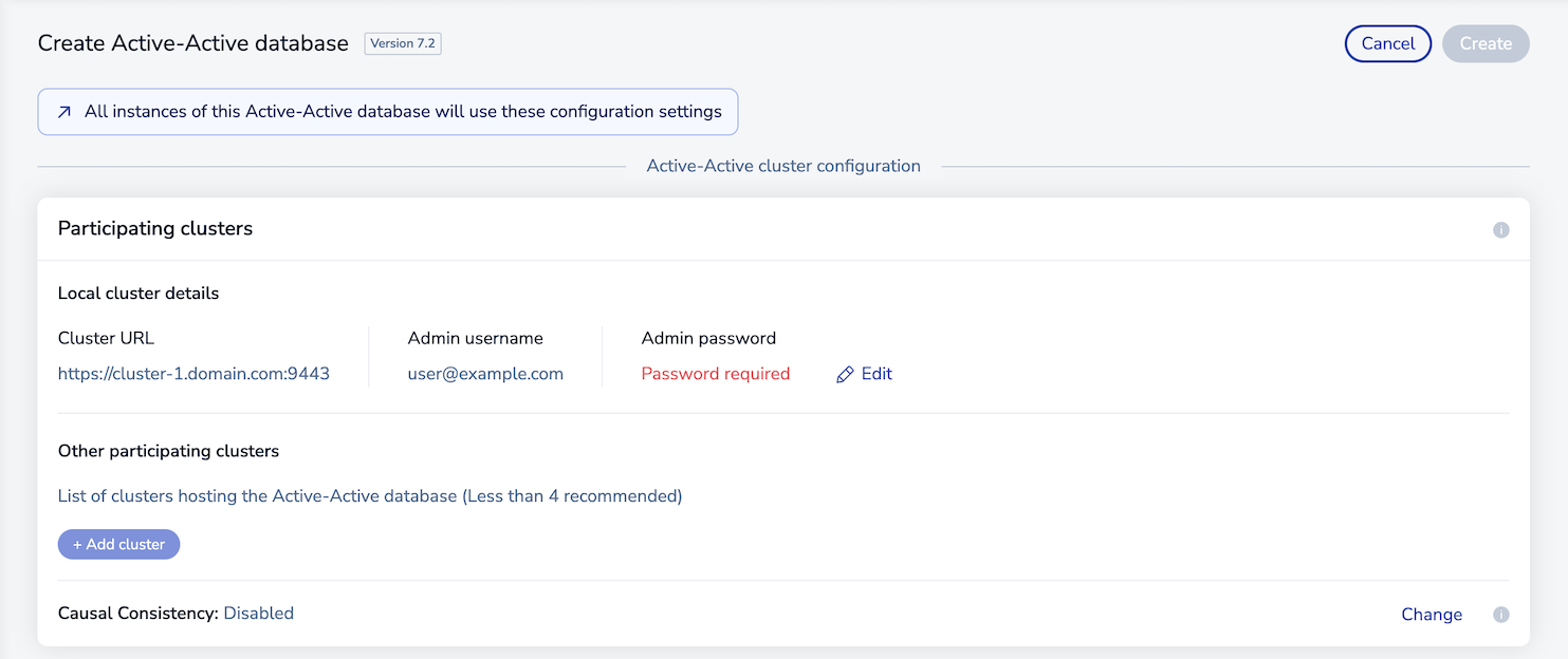 When you create an Active-Active database, you can enable causal consistency in the Cluster Manager UI: