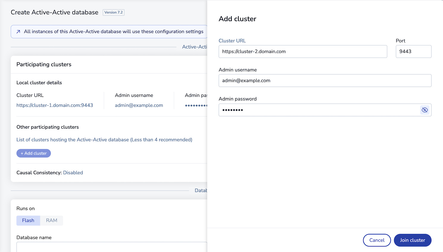 Note:If an Active-Active database runs on flash memory, you cannot add participating clusters that run on RAM only. -