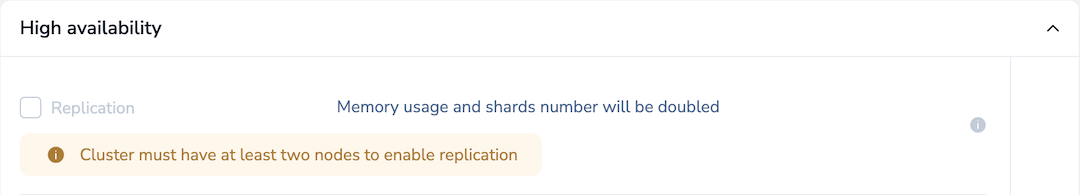 In the High availability section, turn off Replication since each cluster has only one node in this setup: