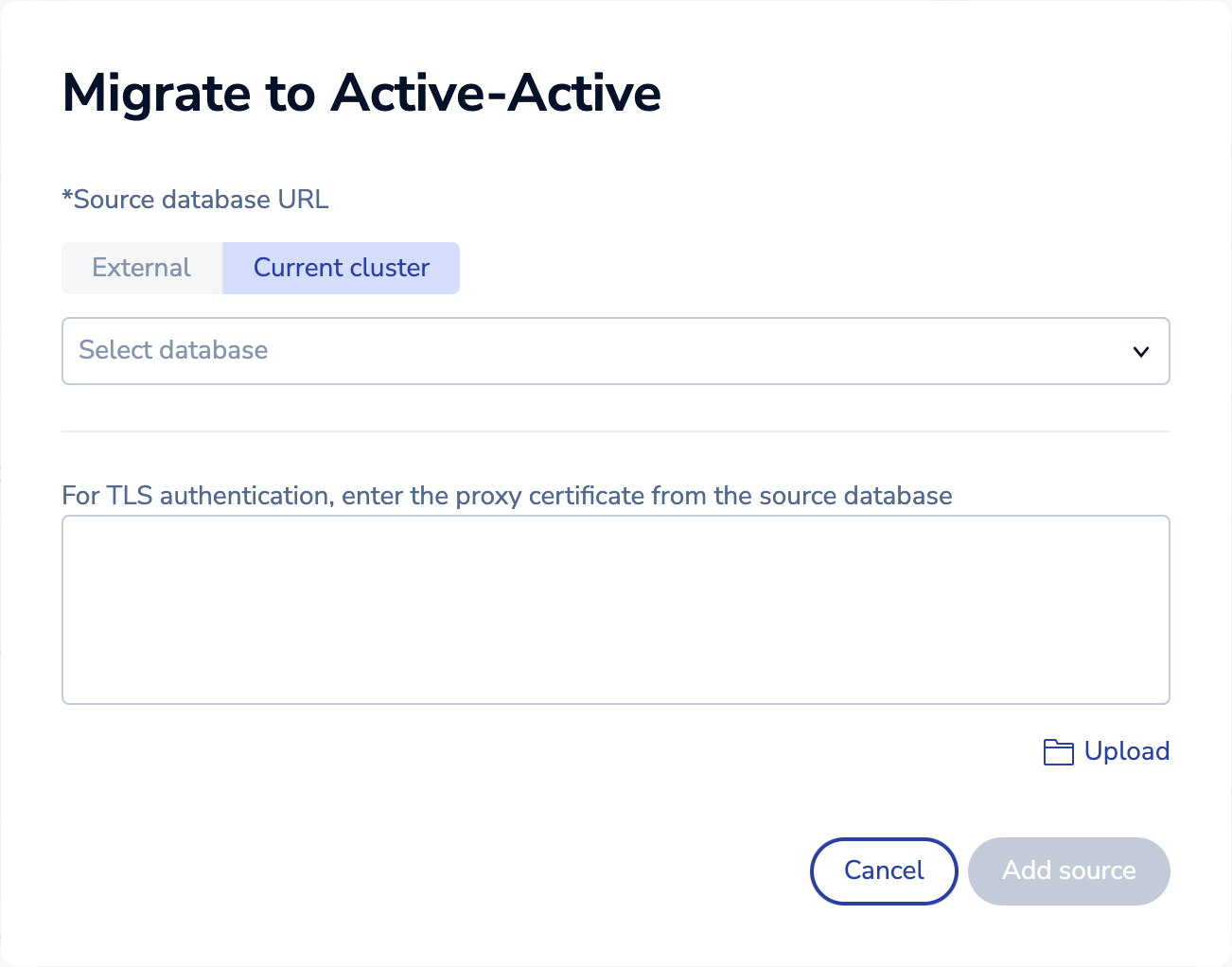 In the Migrate to Active-Active dialog, select External: