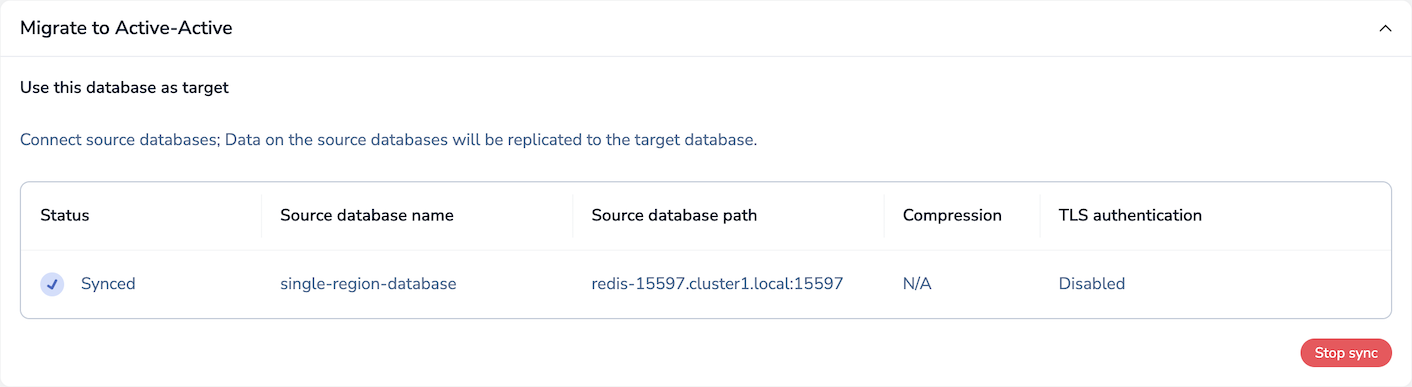 In the Migrate to Active-Active section, click Stop sync: