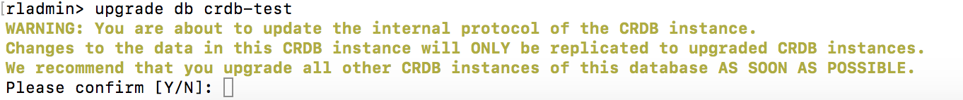 crdb-cliwill ask you to verify all Active-Active database instances and their modules have been updated before you enteryto continue:Verify that all CRDB database instances and their modules have been updated. Do you want to continue? (y/n): y